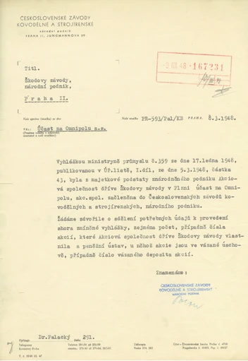 Obnovení obchodní činnosti společnosti OMNIPOL, zároveň znárodnění mateřské Akciové společnosti dříve Škodovy závody v Plzni.