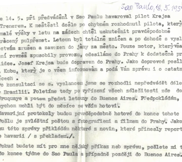 K neštěstí došlo 14. května po chybném rozhodnutí pilota, který z malé výšky v letu na zádech chtěl uskutečnit pravděpodobně obrácený půlpřemet. Letoun byl totálně zničen a po dohodě s vyslanectvím zavezen do jámy za městem,“ stojí v dopise, který vedoucí výpravy Luděk Skočdopole zaslal 18. května do pražského sídla společnosti Omnipol.